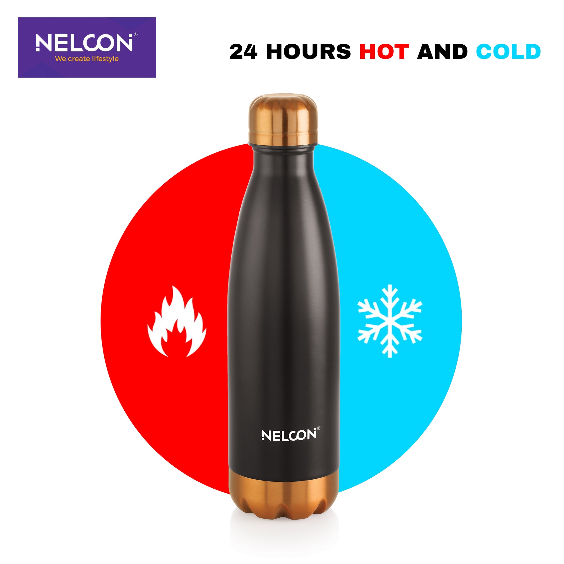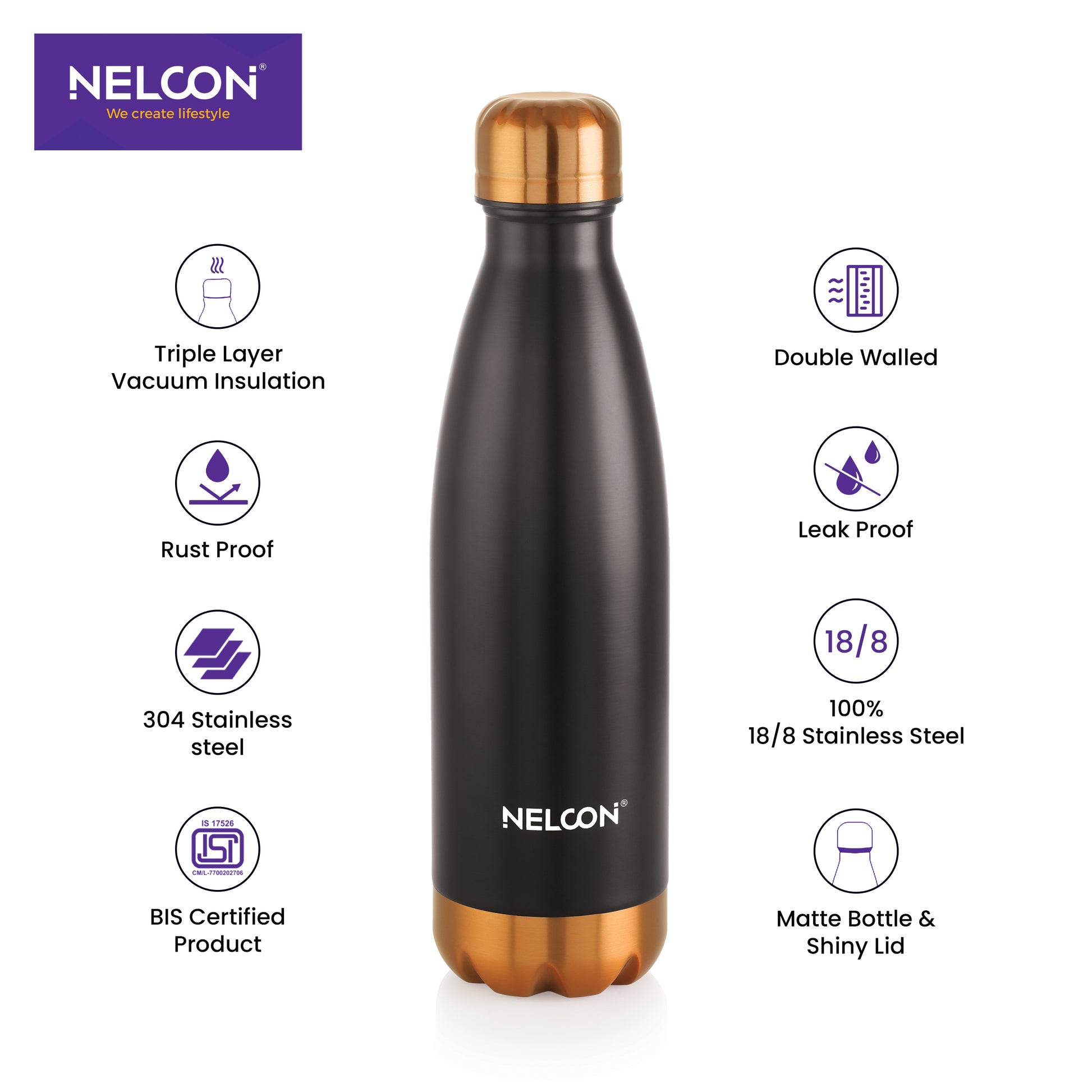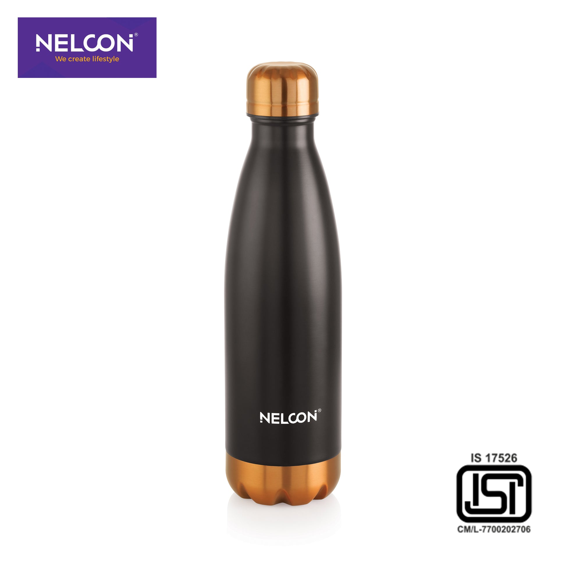 Copper electro black fusion: the Nelcon Industries Cola Black Electro 500ml double wall vacuum insulated stainless steel water bottle�24 hours insulation. 18/8 stainless steel, BPA-free, stylish�perfect for unique tastes in gym or urban eco-use.