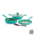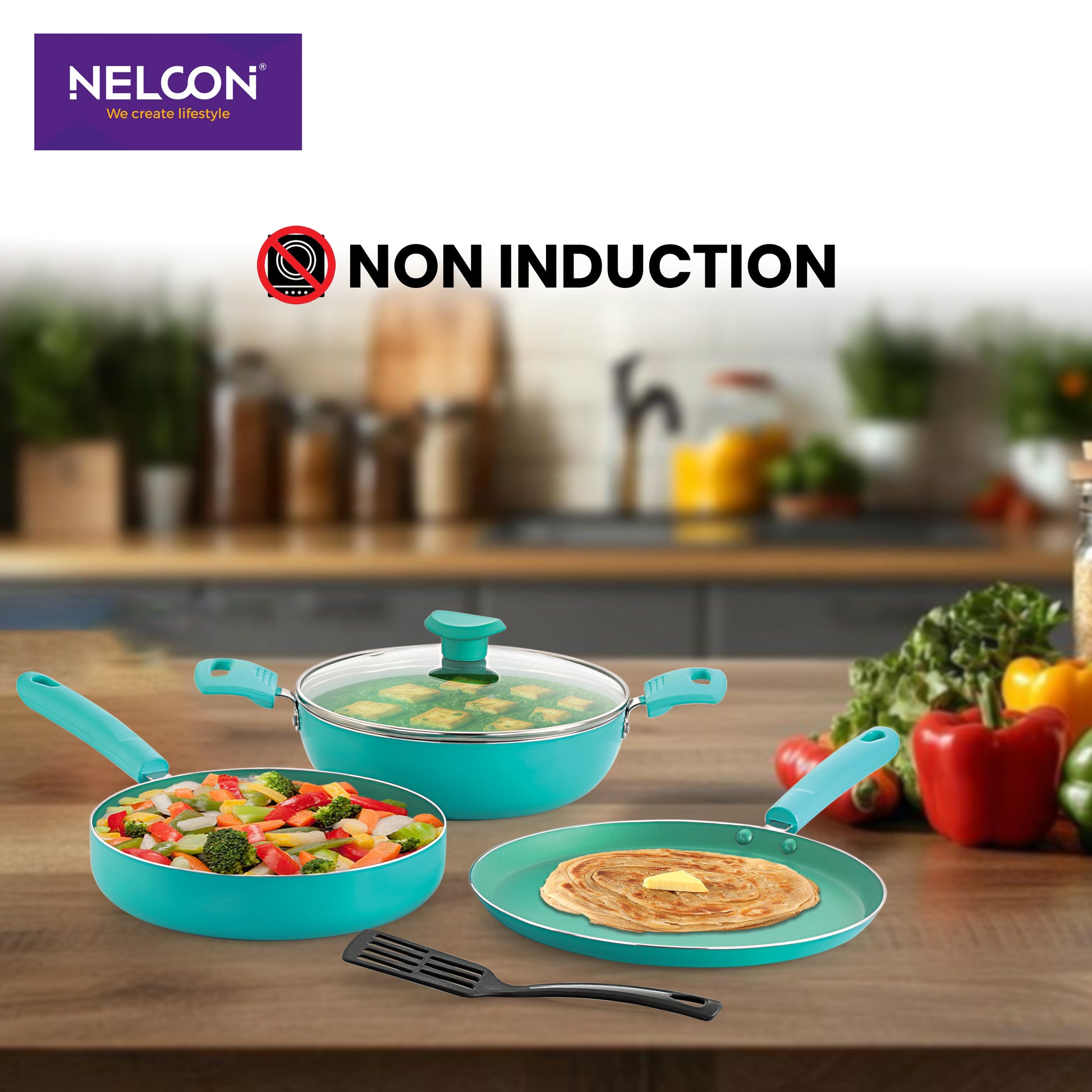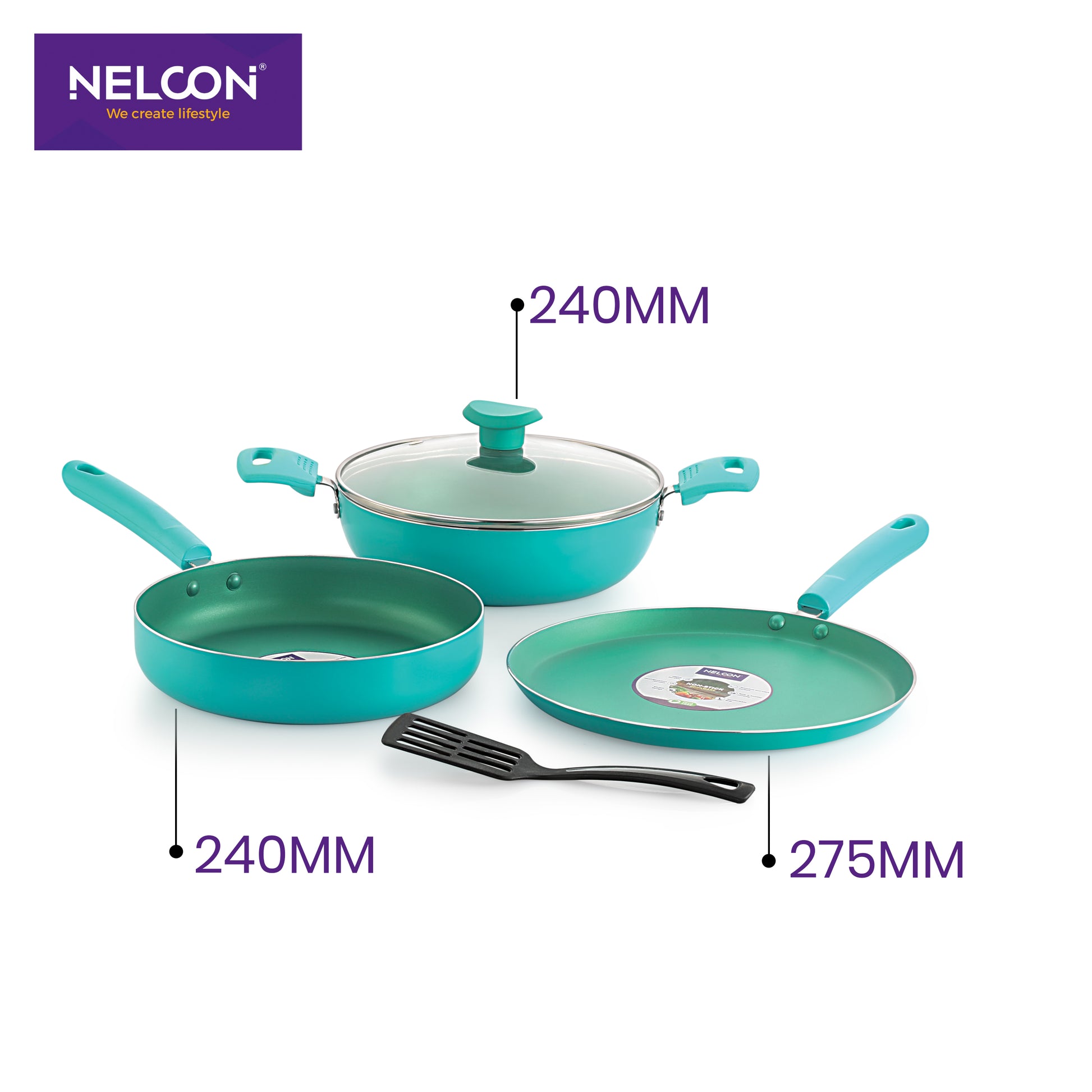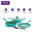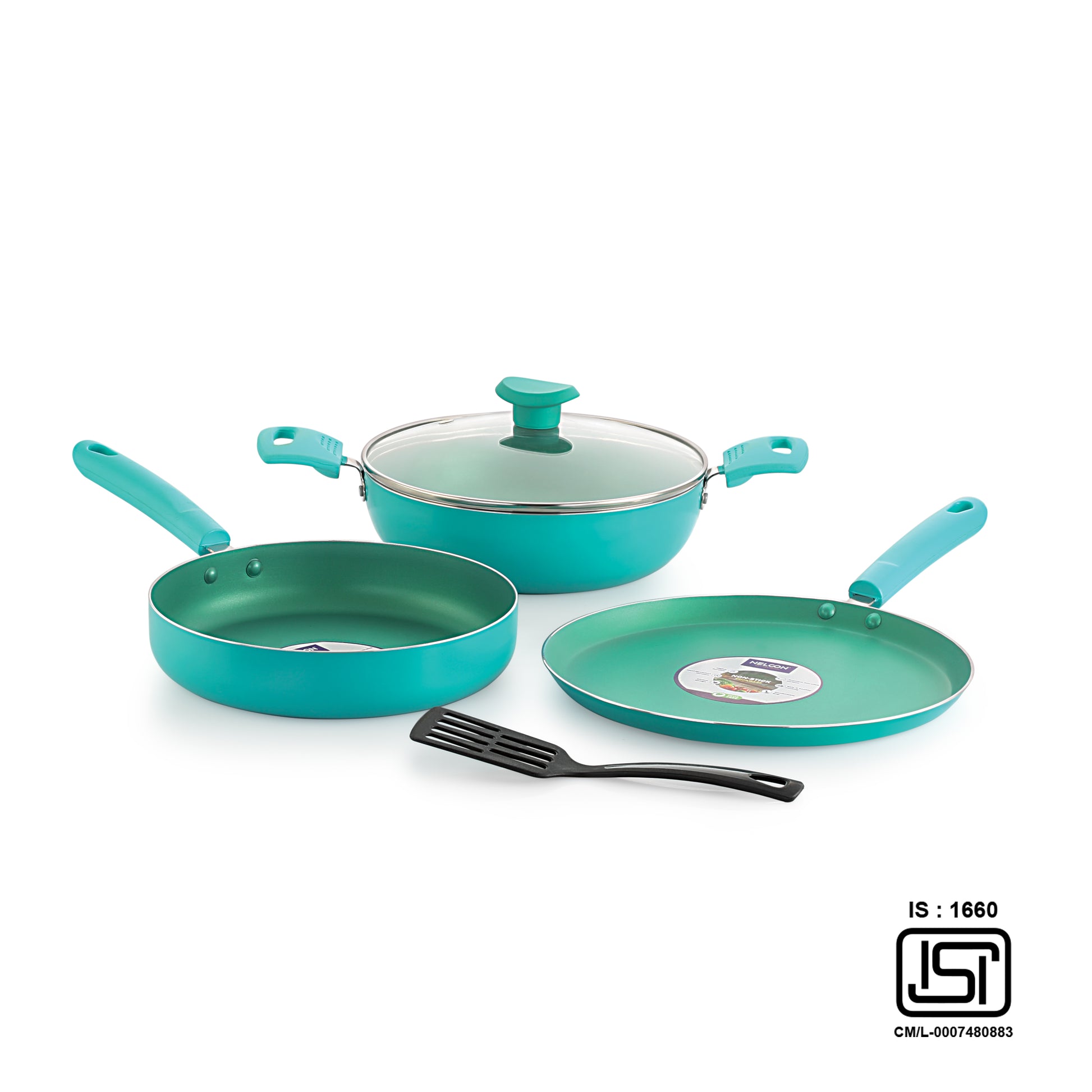 Ride the wave of flavor with the Lifter ChefXpert 4-piece non-stick cookware set, its soothing sea green finish and lively color handles bringing coastal calm to chaotic kitchens. The 3-layer inner color coating delivers dazzling non-stick performance, perfect for poaching fish or caramelizing fruits with a light touch that maximizes freshness and fun. Ideal for wellness warriors, it promotes fat-free frying and even heat for nutrient-packed plates, turning breakfast scrambles into seaside escapes. Color-infused interiors resist fading, while sturdy builds handle high heats without warping. Wave goodbye to scrubbing marathons—quick soaks suffice, leaving you energized for recipe experiments that refresh body and soul.
