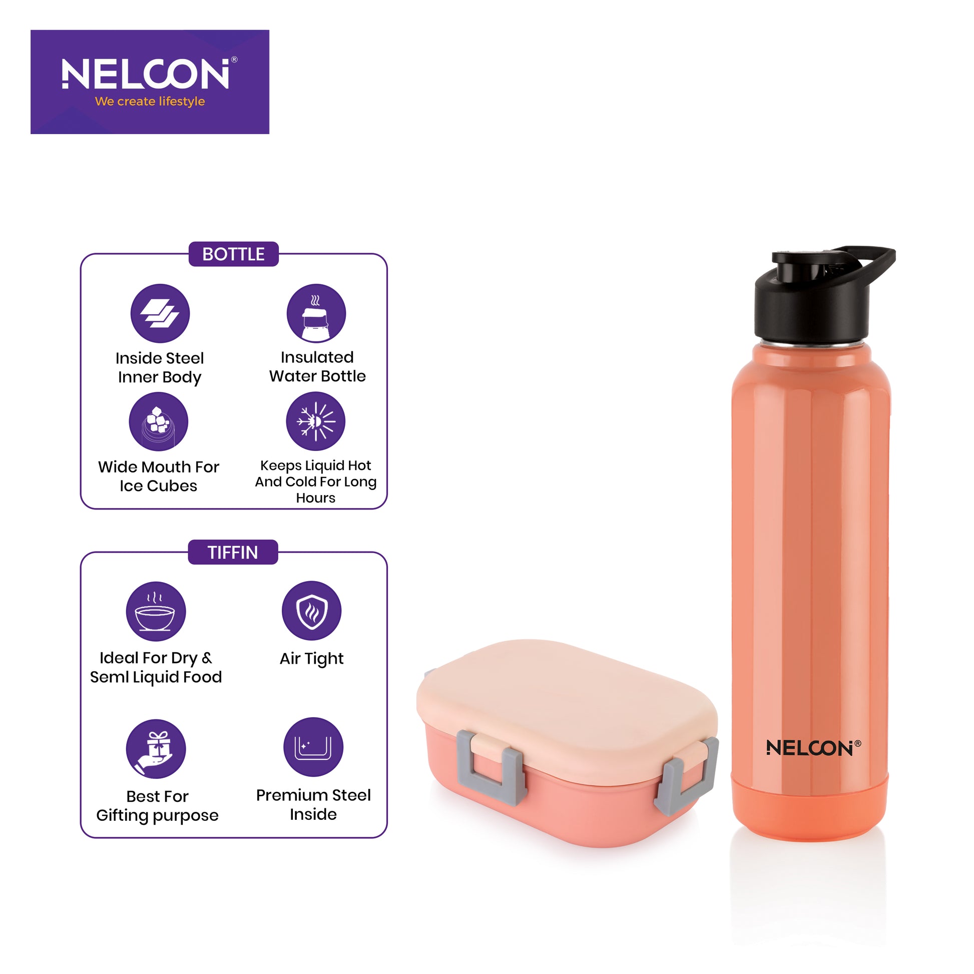 Neo Steel X Aura Combo Set - Peach (900ml Bottle + 1 PC TIFFIN)