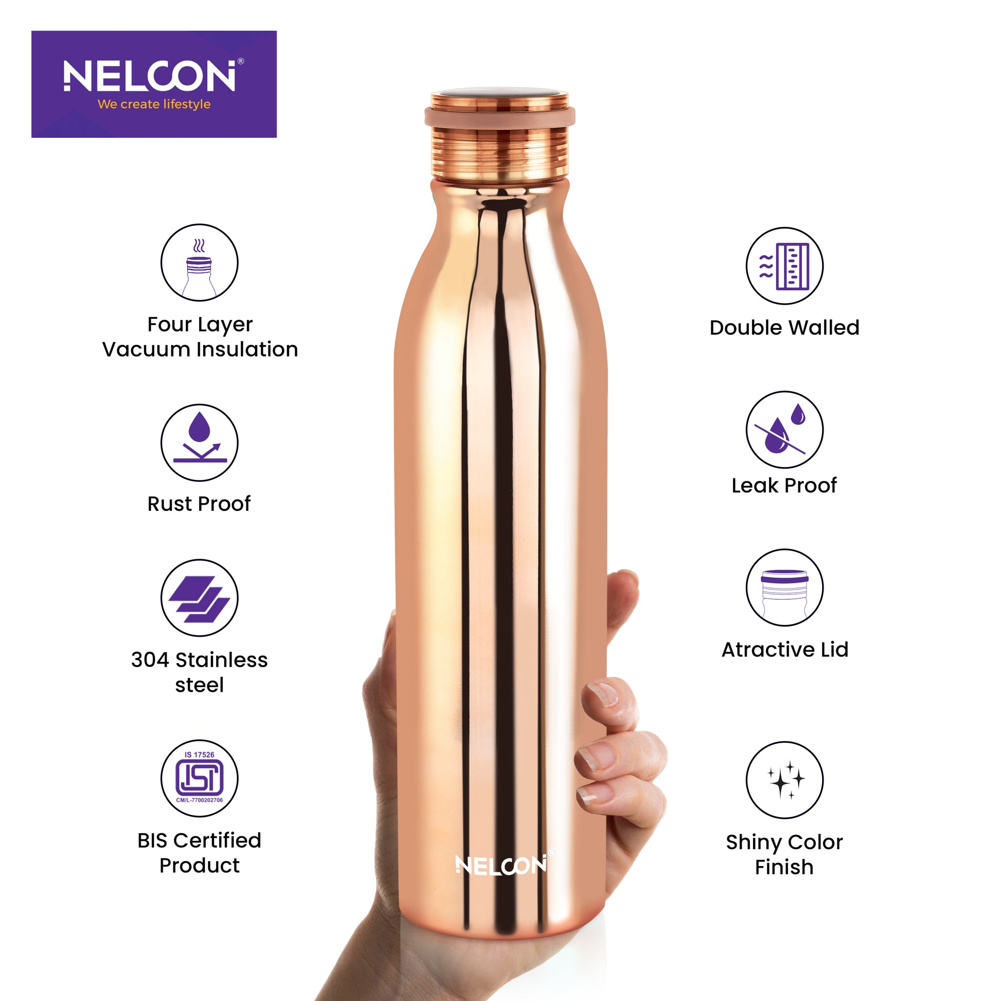 Warm copper Stark: Nelcon Industries Stark 1000ml double wall vacuum insulated stainless steel water bottle insulates for 24 hours. Premium 18/8 stainless steel, BPA-free, durable�perfect for earthy tones in hiking, office, or travel.