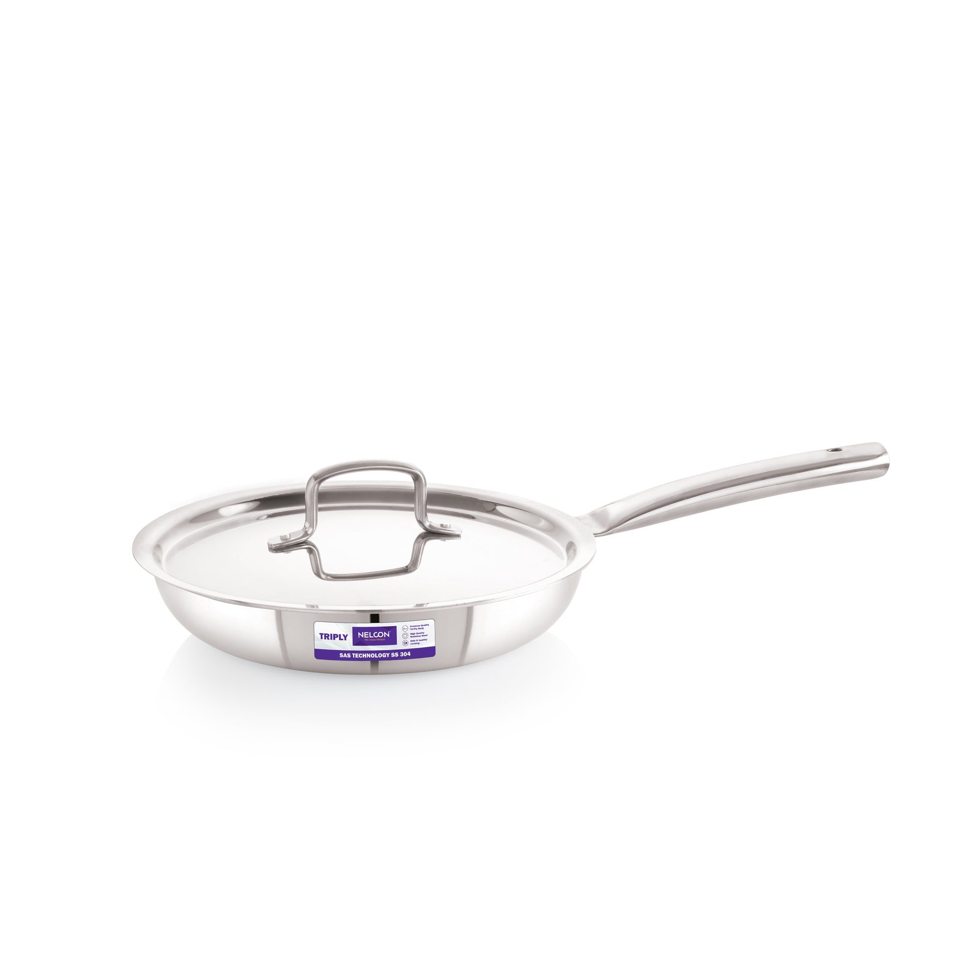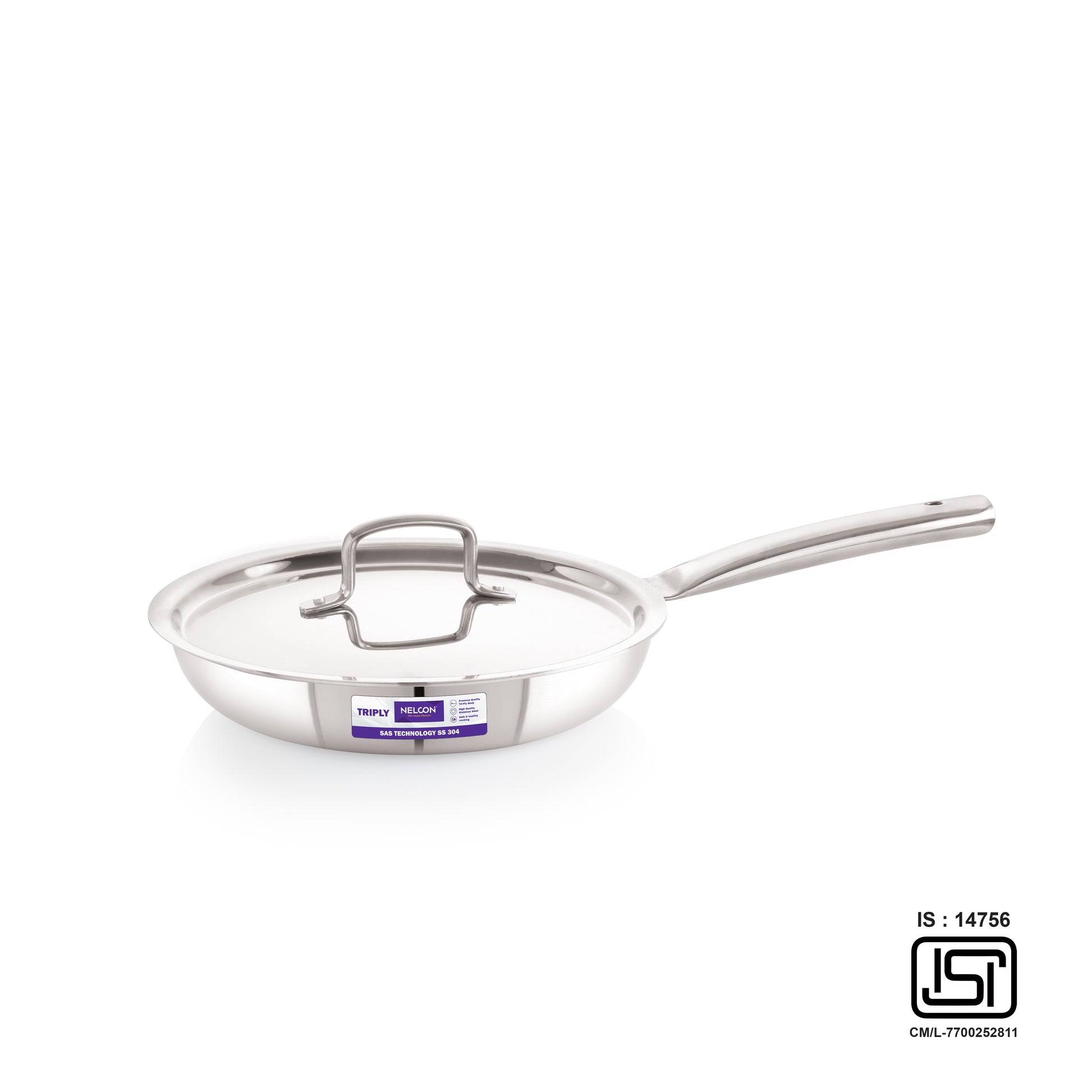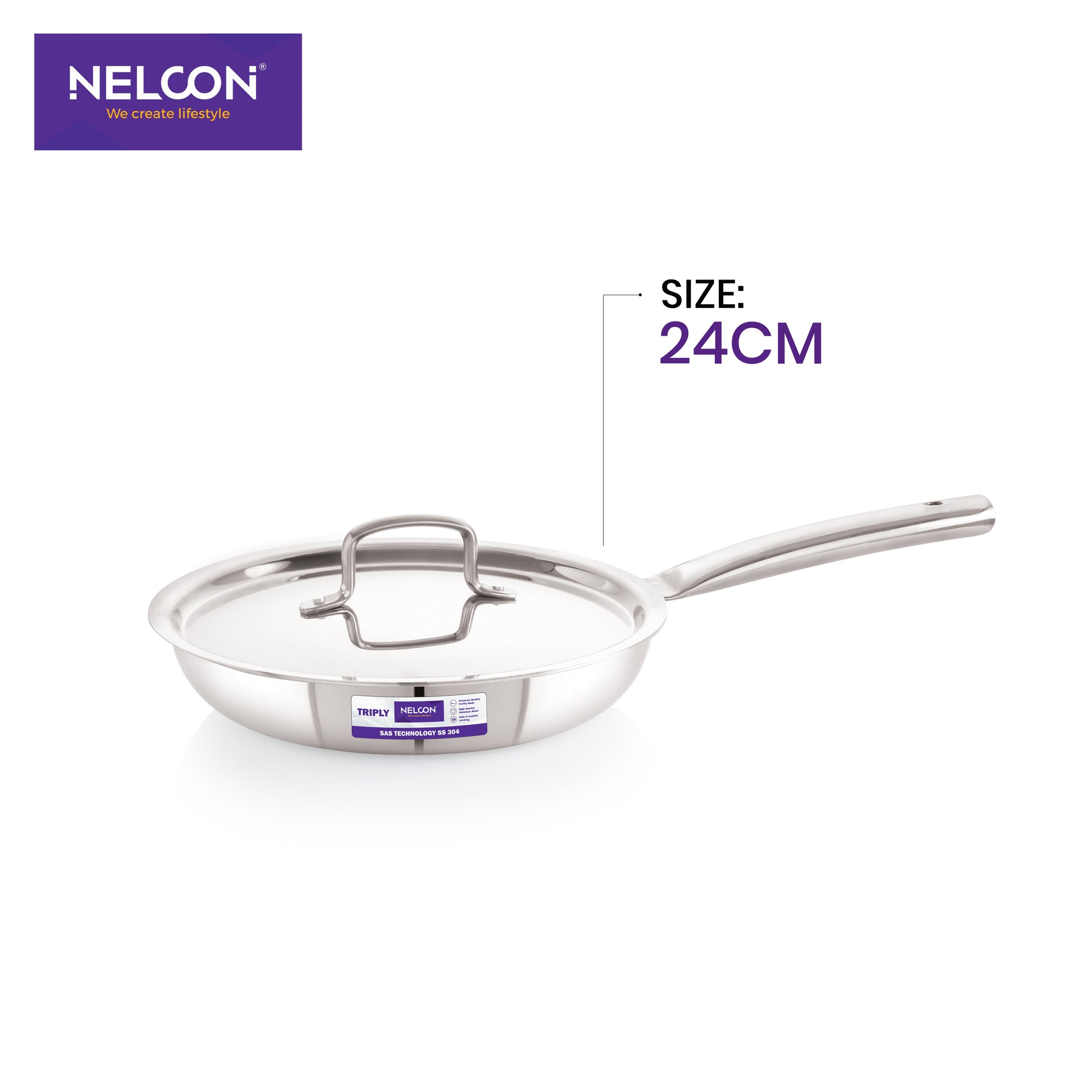 Triply Stainless Steel Fry Pan Induction Base Stainless Steel Lid Pipe Handle 24cm