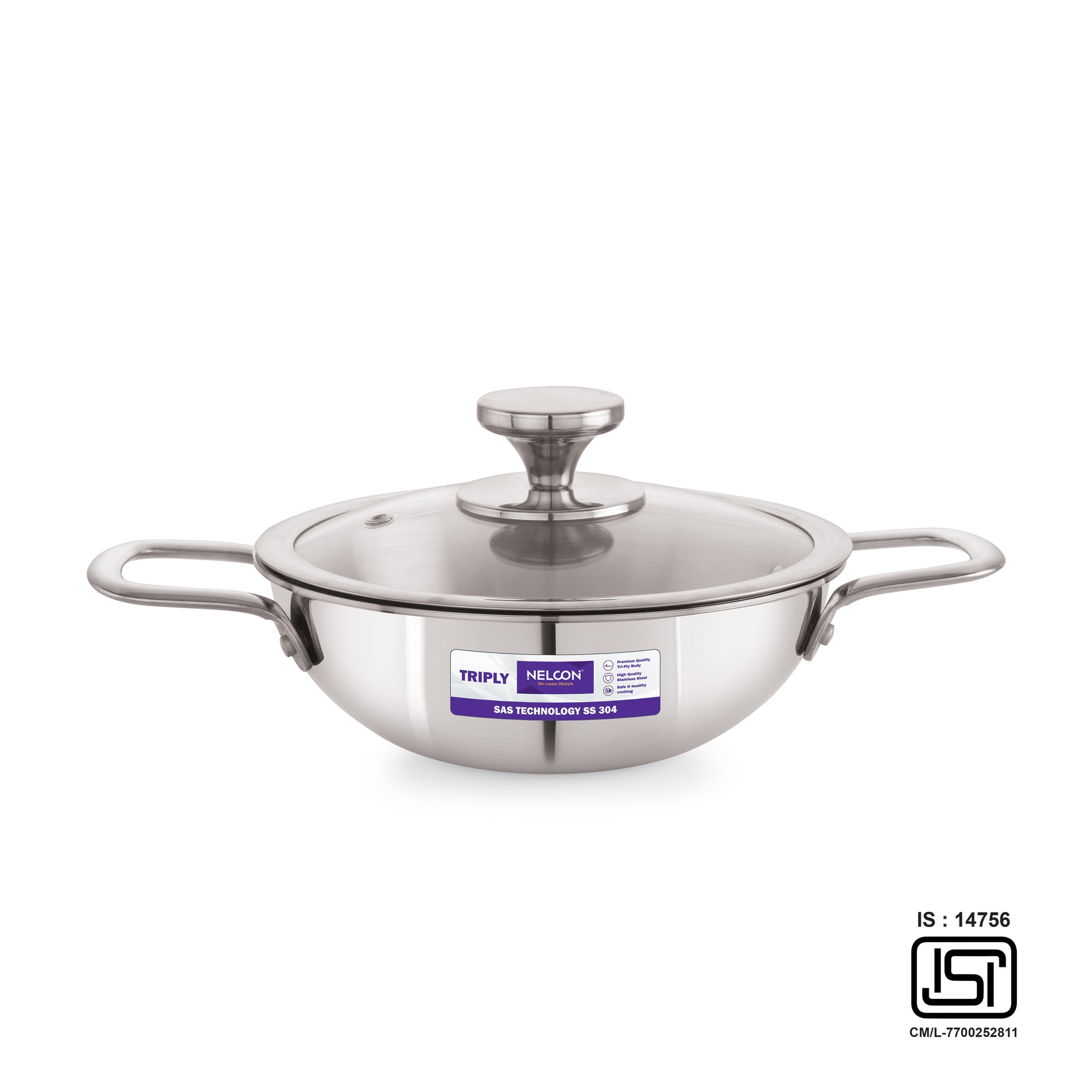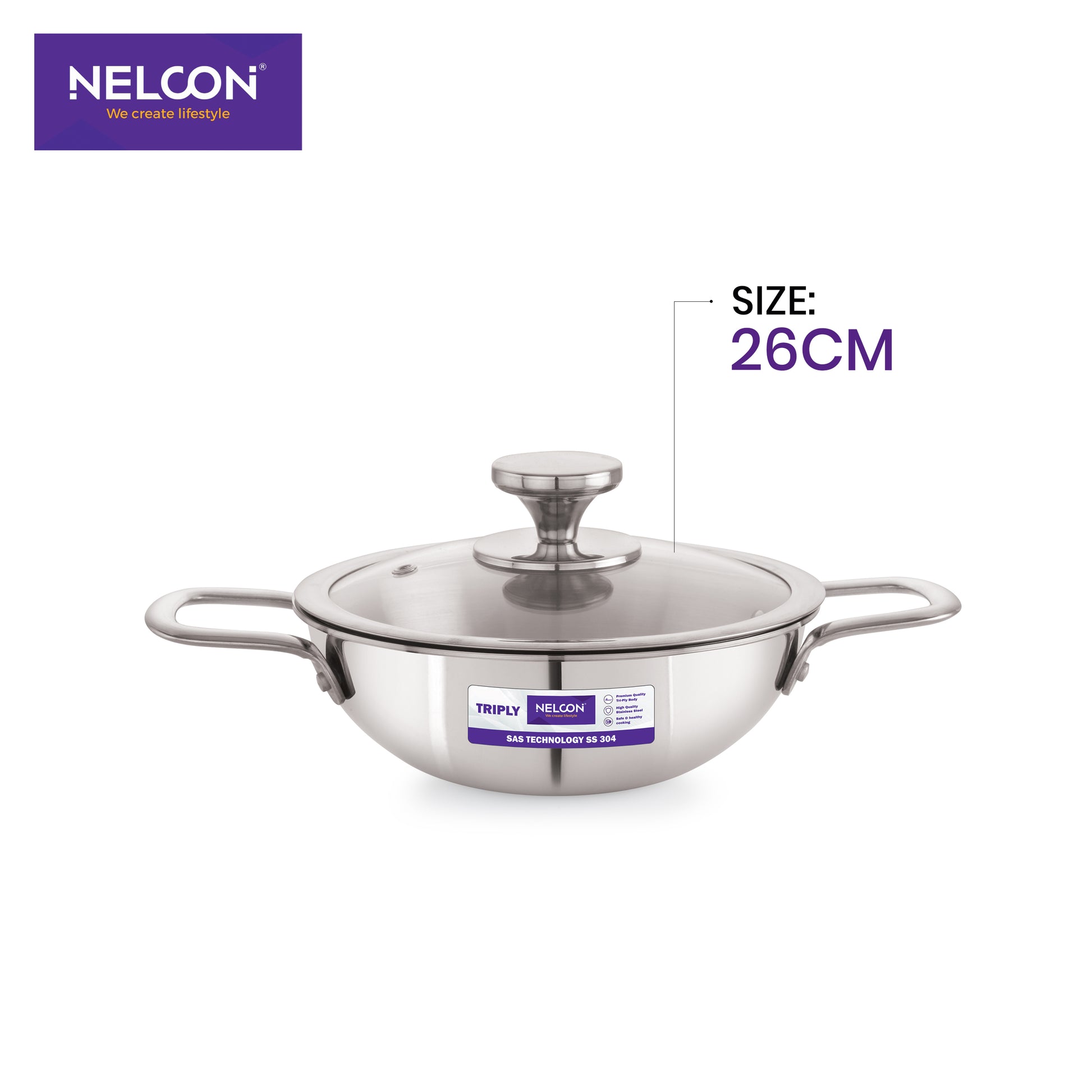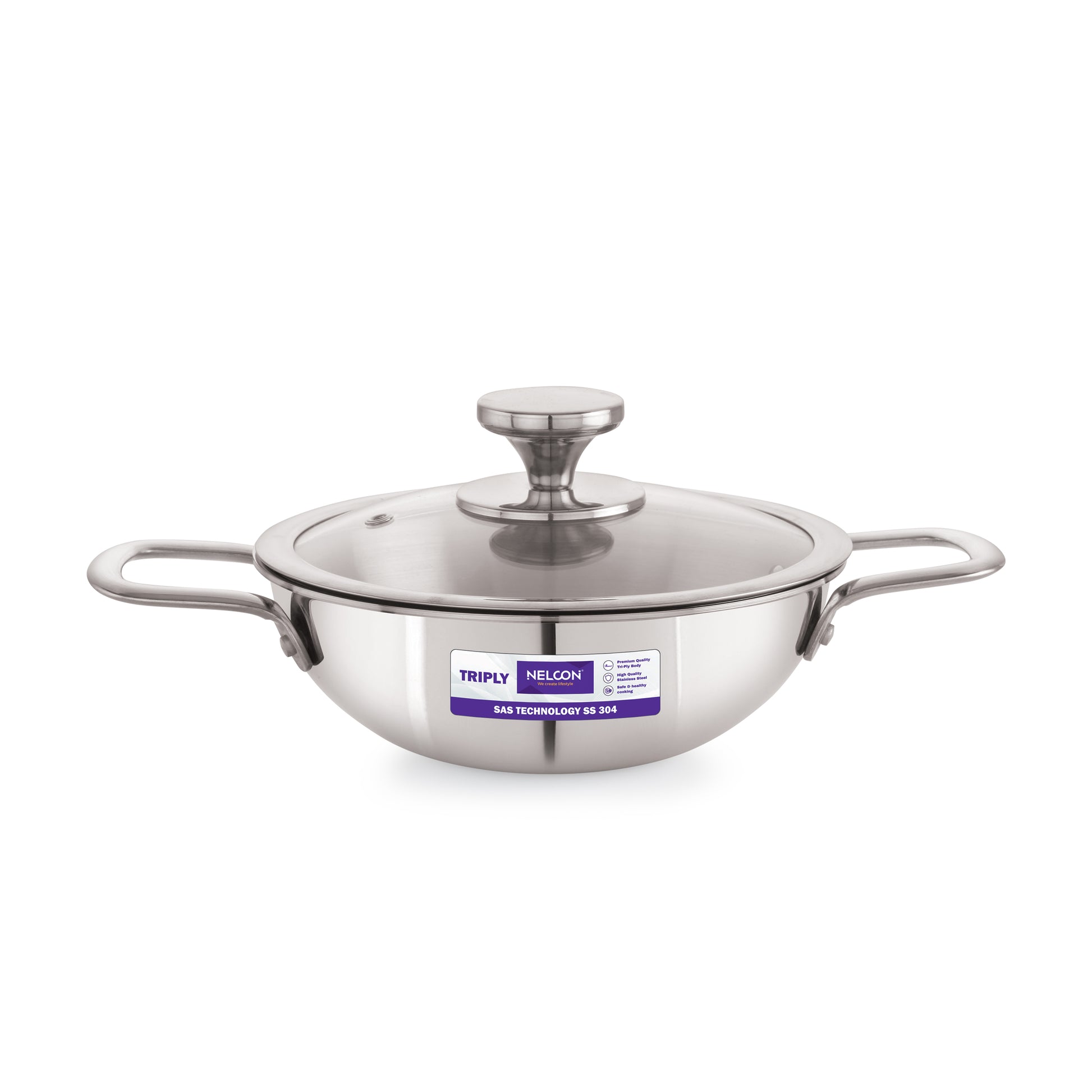 Triply Stainless Steel Kadai Large Glass Lid & Induction Base 26cm