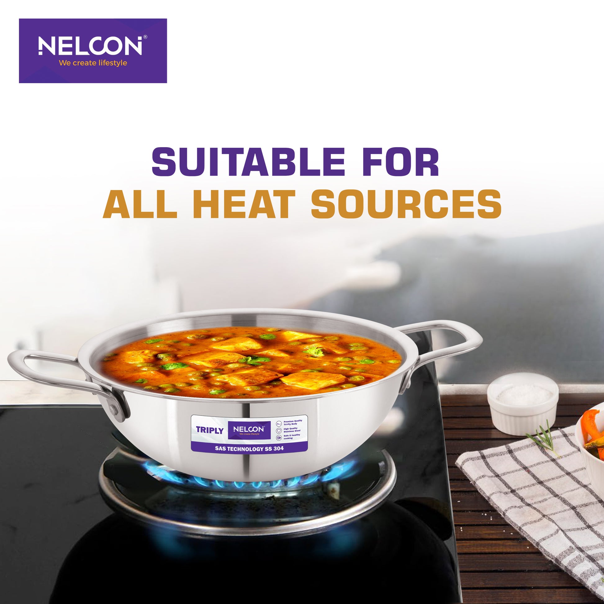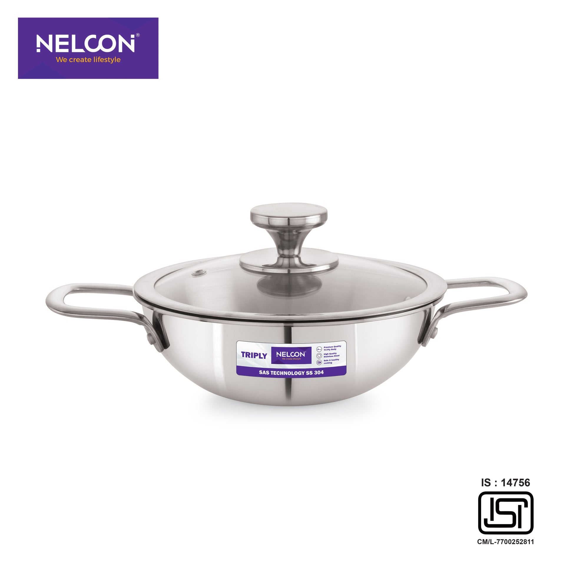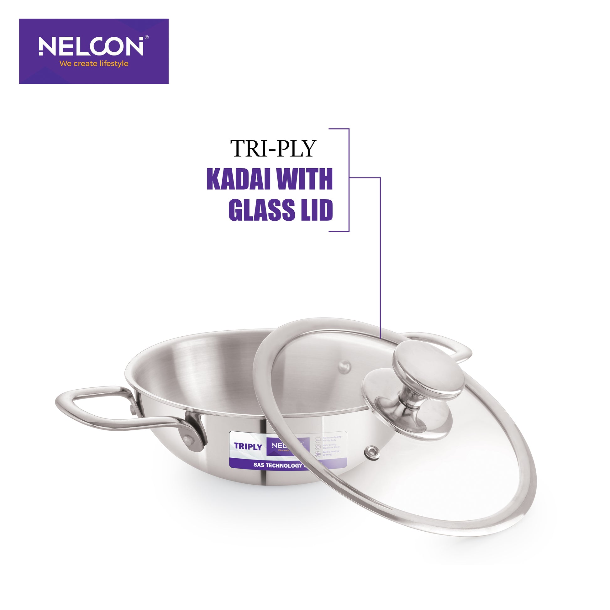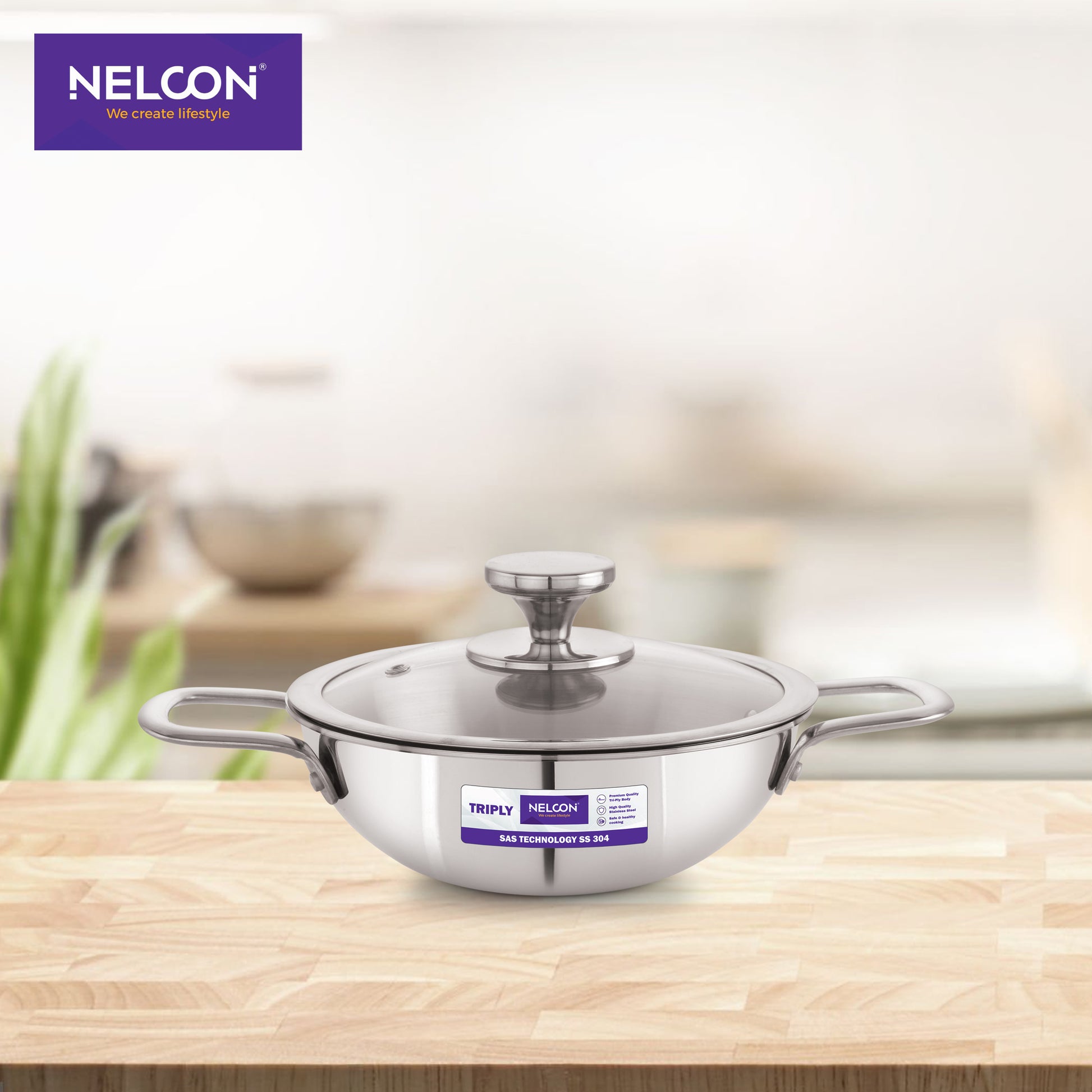 Triply Stainless Steel Kadai Large Glass Lid & Induction Base 26cm